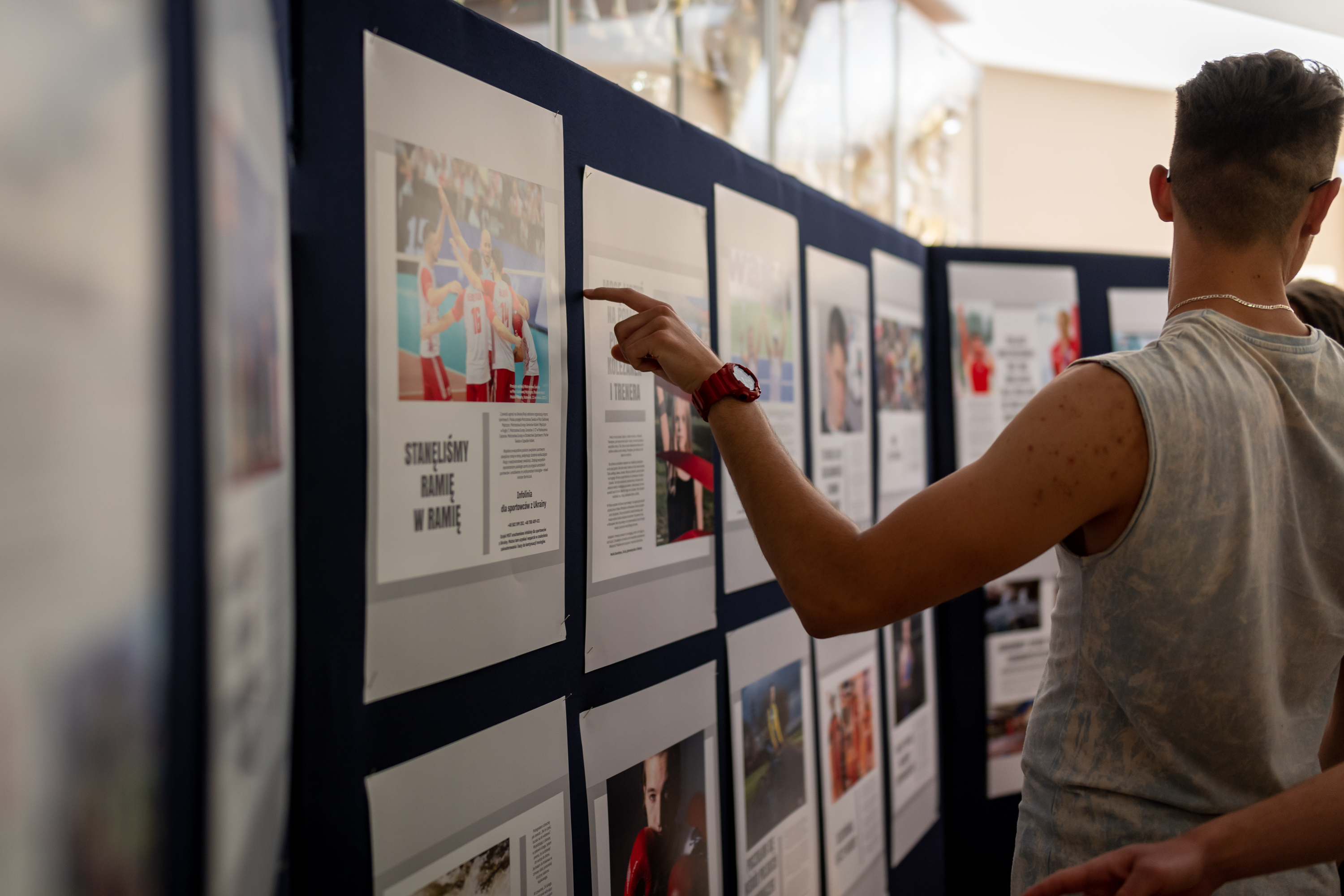 Wystawa „Maraton solidarności. Polski sport dla Ukrainy” cieszyła się ogromnym zainteresowaniem. Postawiliśmy ją w korytarzu przy wejściu. Trwały dni otwarte, więc nie tylko nasi uczniowie, ale też uczniowie szkół podstawowych, różni interesanci, którzy do nas przychodzili, mieli okazję obejrzeć wystawę. Chętnie zapoznawali się z treściami na temat sportowców oraz z ideą połączenia dwóch światów: wojny i pokoju.