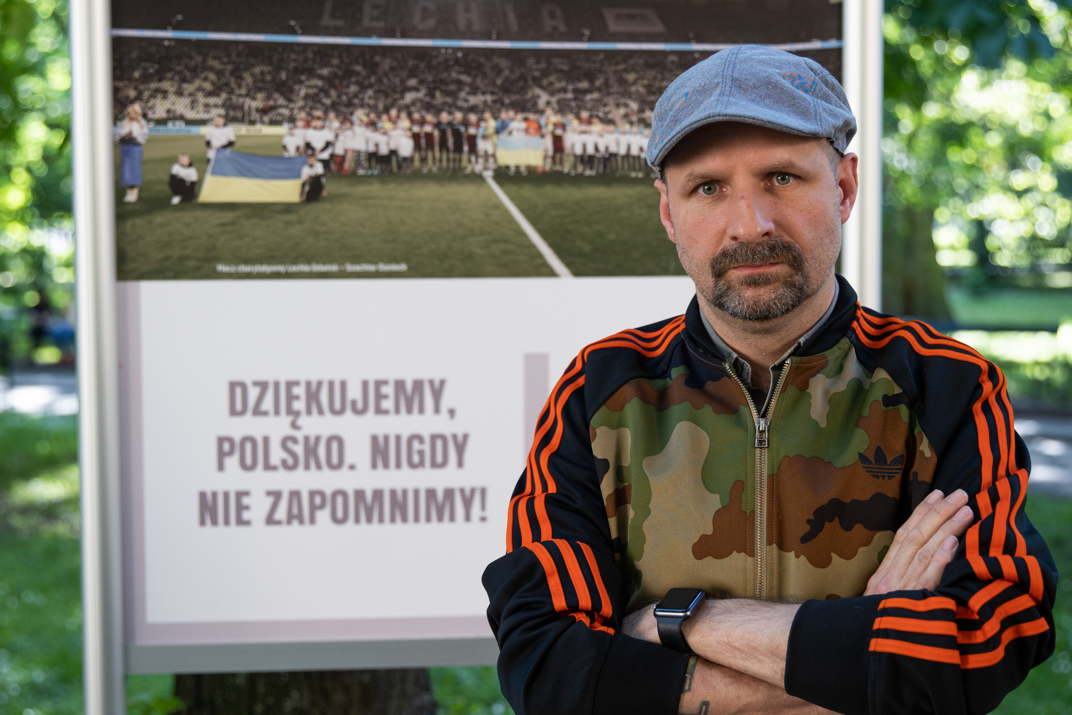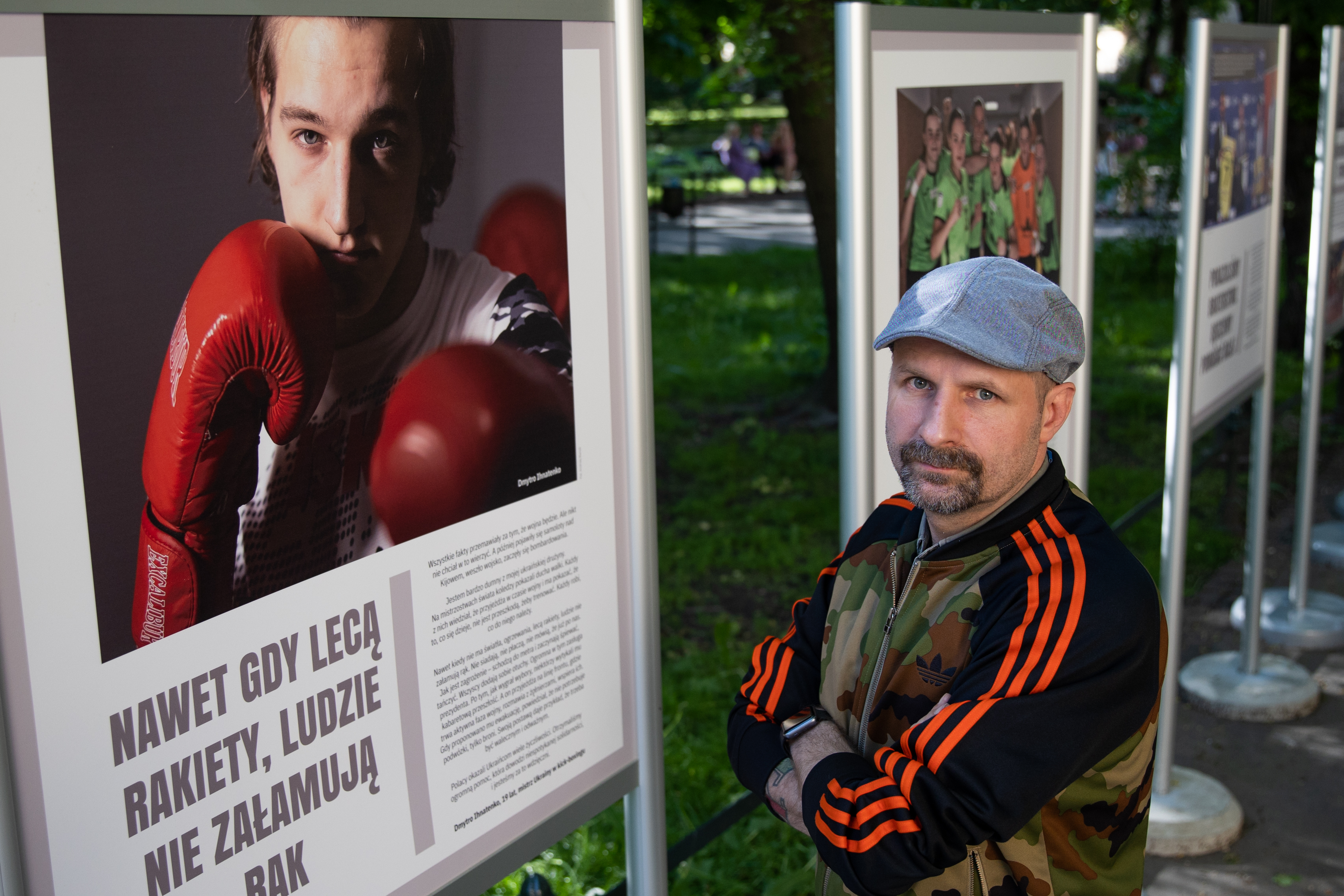 – Wystawa sprawiła, że poczułem dumę z narodu polskiego, z tego, jak się zachowaliśmy, jak poparliśmy Ukrainę. Ale przypomniała mi coś jeszcze. Mniej więcej trzy lata temu na jednym z turniejów hokejowych w Krakowie zagrała drużyna z Donbasu. Przyjechali autokarami wraz ze swoją publicznością. Mój syn, wtedy dwuletni bobas, dyrygował tą publicznością, widać to na jednym ze zdjęć. Pamiętam starszą, przesympatyczną panią, która dała mu cukierka. I teraz martwię się, czy ci wszyscy ludzie żyją. Czy ta pani żyje? Była taka uśmiechnięta… Mam nadzieję, że pewnego dnia uda mi się ją odnaleźć i poczęstować ją cukierkiem – mówi Adam Grzanka, aktor kabaretowy, konferansjer, satyryk, muzyk.